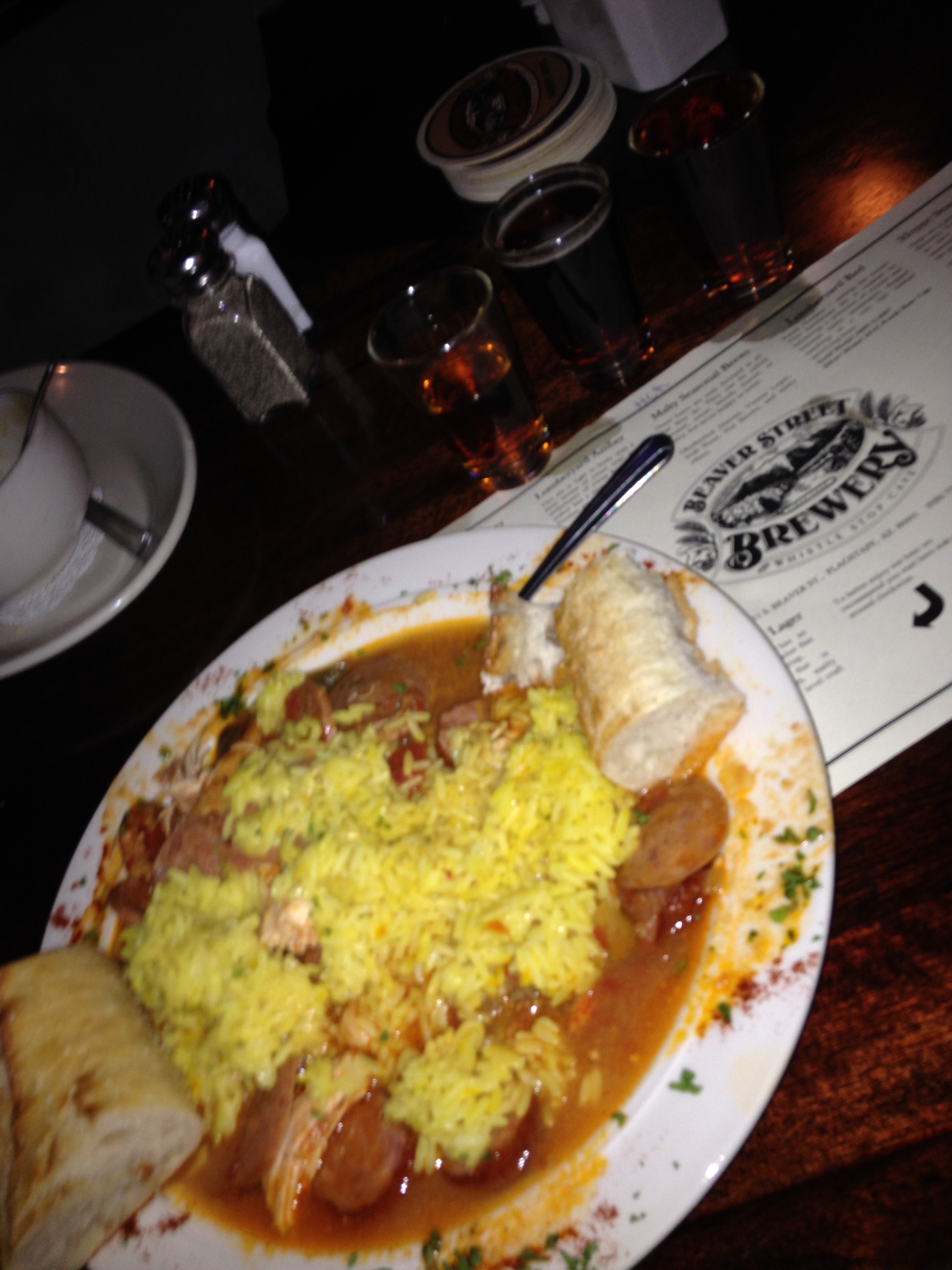 Anyway, I had the pleasure of sampling some of the food at Beaver Street. The menu has a soup and chili section as well as a several choices of sandwiches and woodfired pizzas. Their starters get a little fancier than the typical wings and potato skins that you’d normally find in a place that looks like this. They bring out the big guns with steamed mussels, salmon cakes, hummus and more. They even have a jambalaya platter for people who can’t decide if they want their meals to have sausage, chicken or shrimp, because this shit has all three!