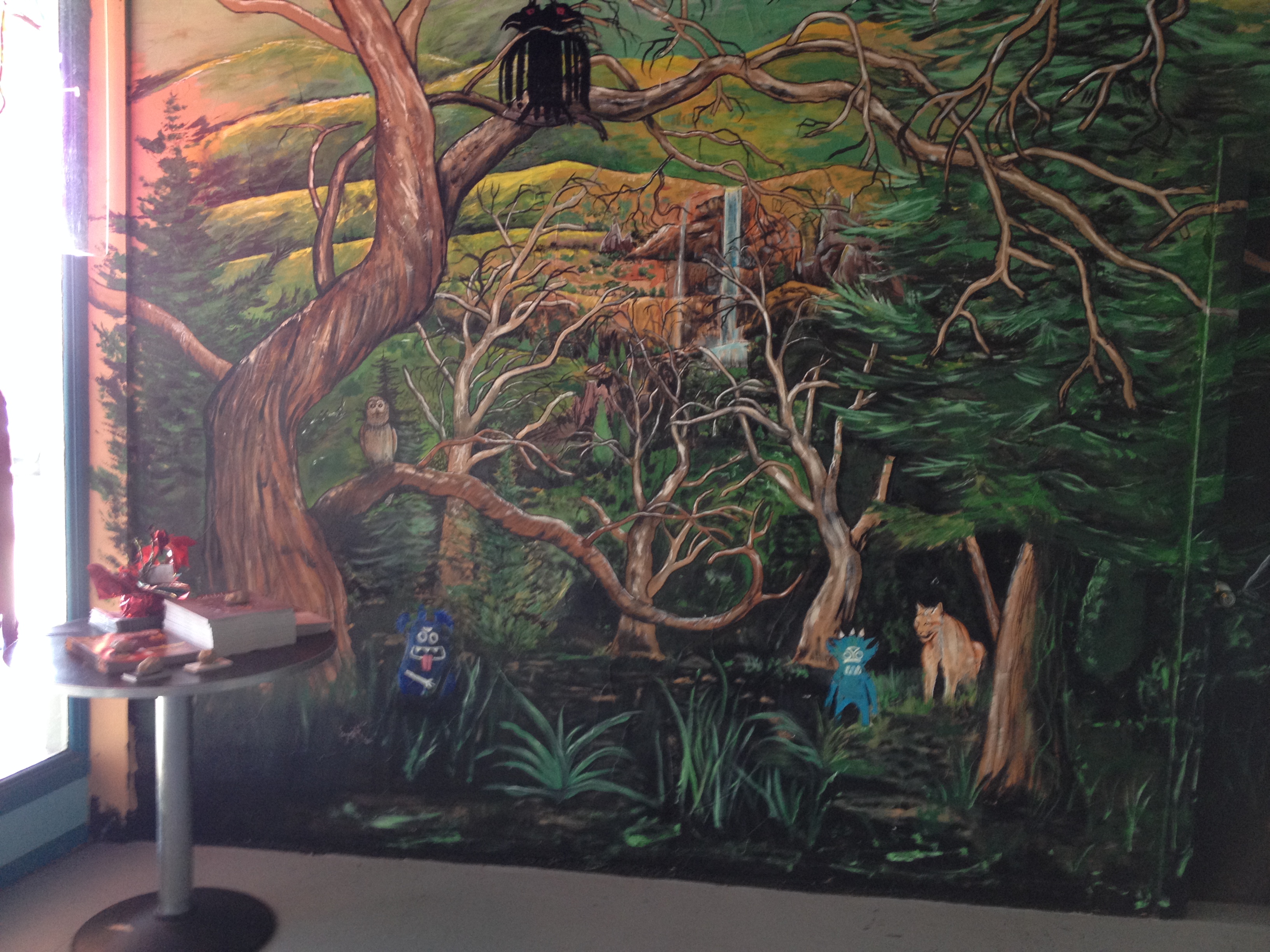 They were made of the real skulls of a coyote, bobcat, skunk and a kudamundi. Growlie spoke up from the image of him painted on the wall behind me and said he personally collected the skulls from each of the animals for use in the tap room.