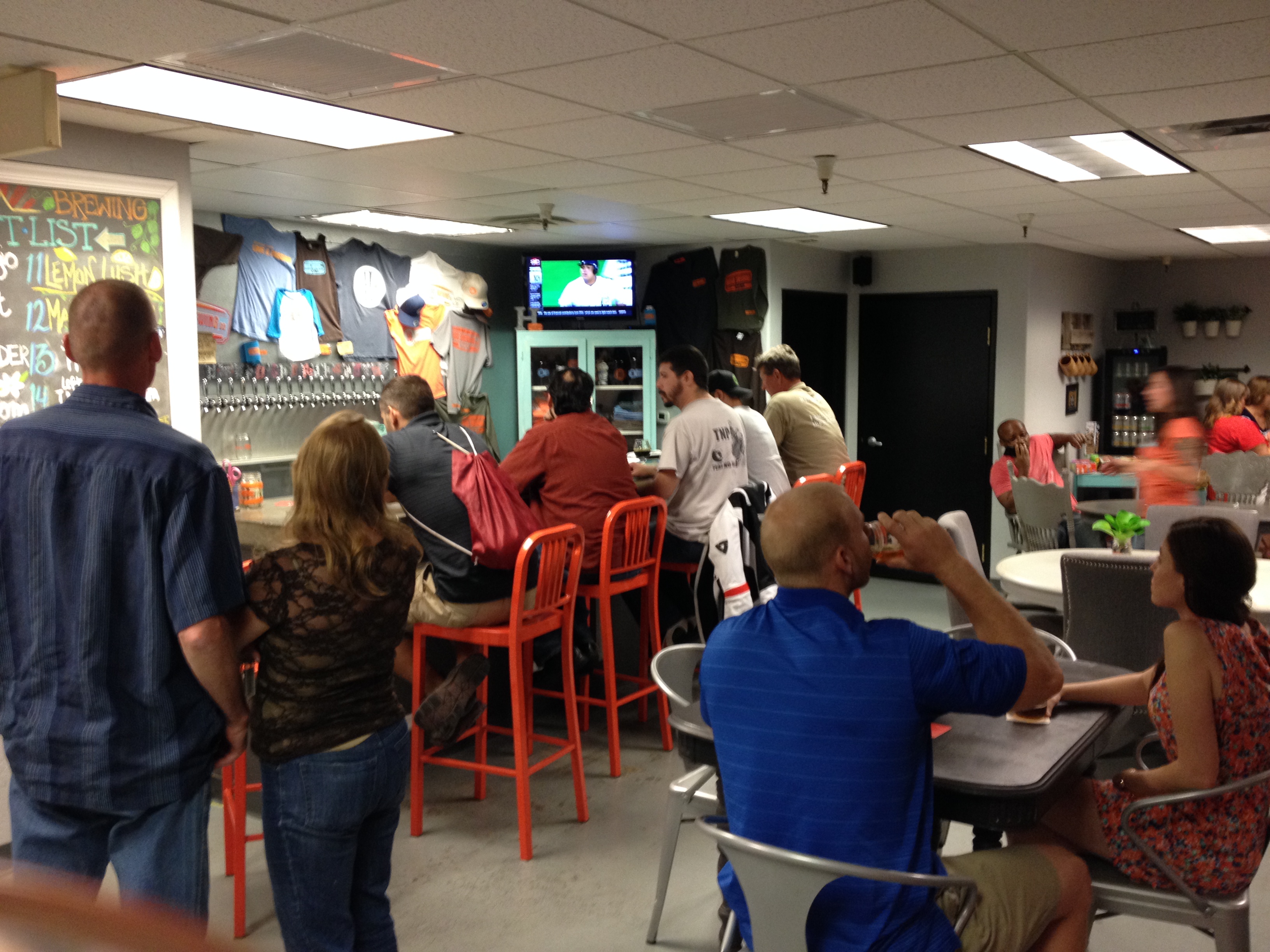The tap room was anything but dark. The lights were all on and the place was pretty packed with several customers chatting each other up and having fun.