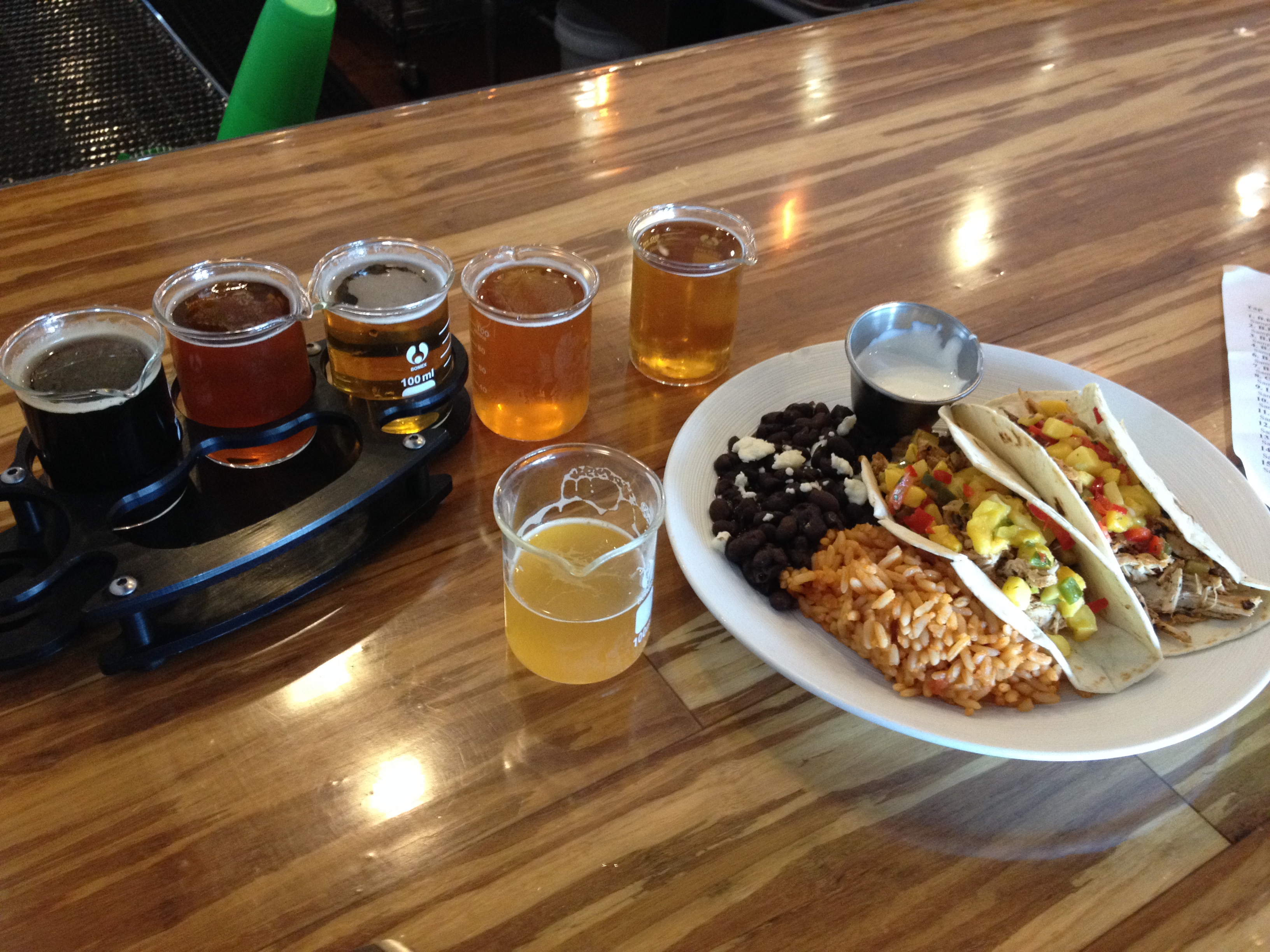 I decided to focus my research on beer instead and got my flight that was poured into these adorable little beakers which fit in with the science theme of the brewery. The first beer was called Intergalactic and it was a saison. Normally saisons are too light in flavor for me but this one had a nice, ever-so-slight spice to it from the added hops. It was a really good light brew for the craft beer newbie who comes in to this place looking for a Michelob Ultra or whatever-the-shit before they go see their terrible movie starring a talking dog or an actress over 30 or something just as implausible as that.