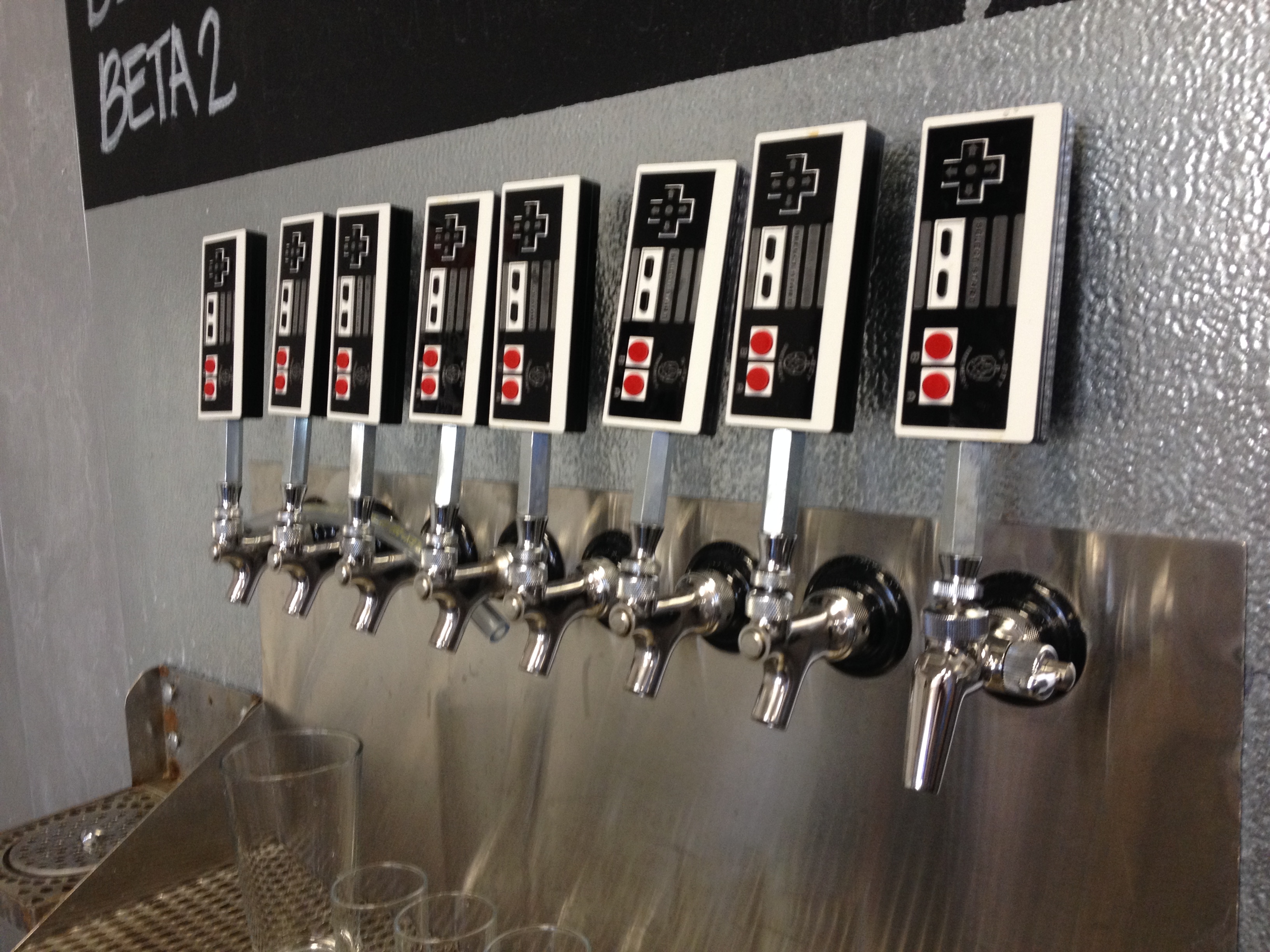 The lovely Maiden behind the bar welcomed us into the tap room with a smile. The place had video-game related art on the walls, table decorations with Mario and other characters, an old school X-Men arcade game and awesome tap handles that were shaped like NES controllers.