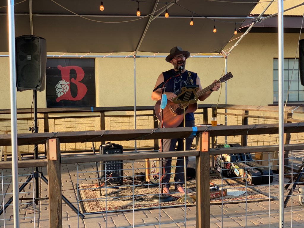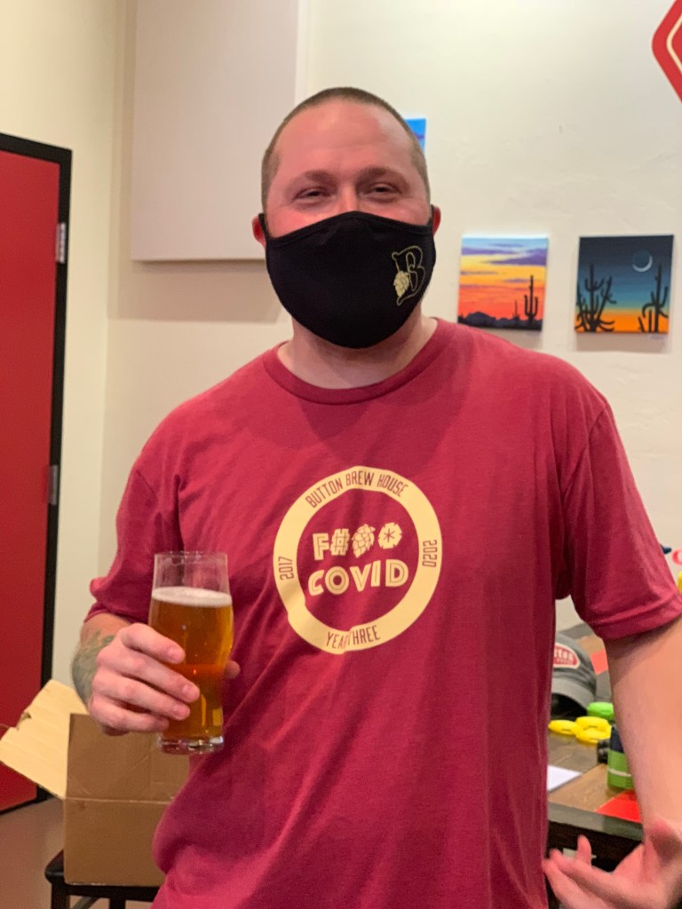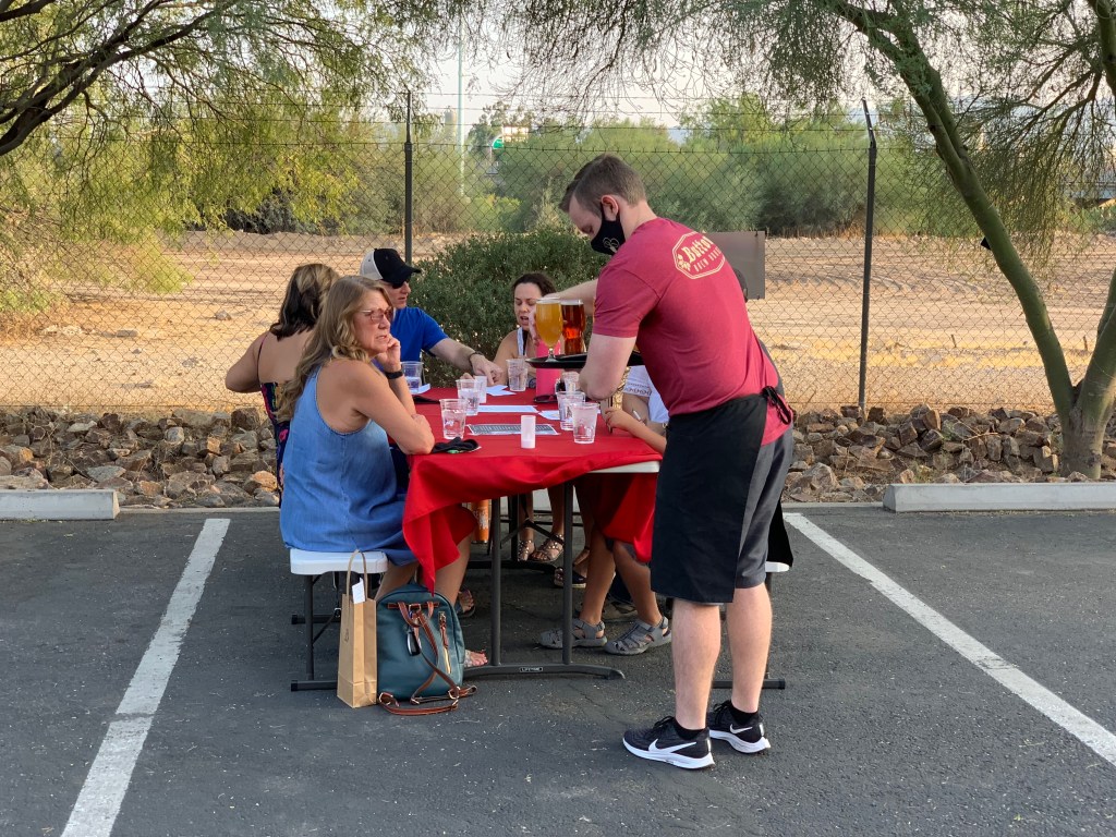 Since public gatherings have been limited to under 50 people by Arizona’s Dept of Health Services, only 48 tickets were made available. A large section of the parking lot was closed off and tables were placed no less than 15 feet apart. No more than 8 people were allowed per table. Guests were asked not to mingle and the only reason they were allowed to go into the taproom was to use the bathroom. Four bartenders on staff became servers for the night and brought beers to the guests’ tables.